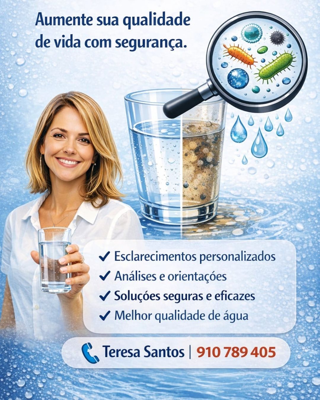 O meu nome é Teresa Santos e sou Delegada Comercial na Vimapur, empresa especializada em sistemas de tratamento e purificação de água. No exercício das minhas funções, acompanho clientes empresariais, restaurantes, serviços de catering e também o segmento doméstico, prestando aconselhamento técnico e comercial ajustado às suas necessidades específicas.